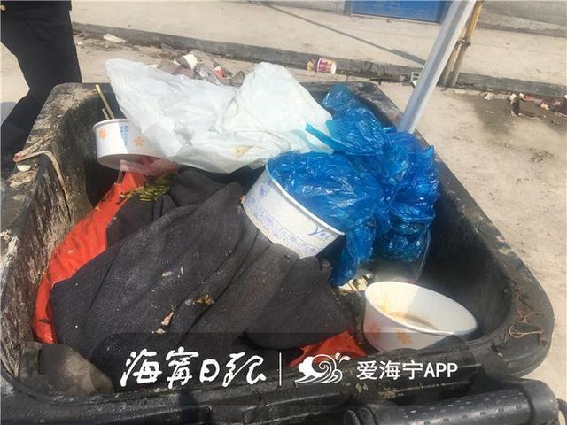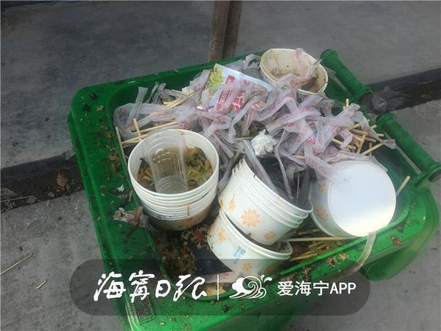 执法人员向记者展示了一组现场检查的照片。从照片中可以看到原本是放置其他垃圾的垃圾桶内,堆满了各种垃圾,有剩菜剩饭,有破旧衣物,有一次性餐盒,甚至还有砖块石头等建筑垃圾。同样在应放置餐厨垃圾的绿色桶内,也混放着一次性餐盒、筷子、餐巾纸等垃圾。