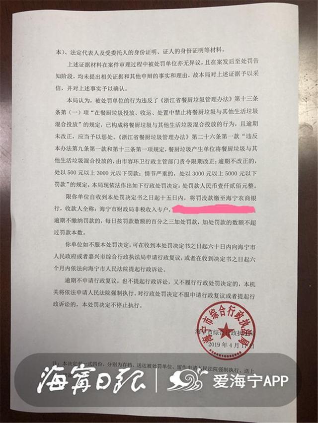 “后期再次检查中,我们发现该公司并未对这个问题进行整改。”市综合行政执法局法制科副科长潘伟忠告诉记者,该公司在接到《责令改正通知书》后逾期未改正,涉嫌将餐厨垃圾与生活垃圾混合投放。